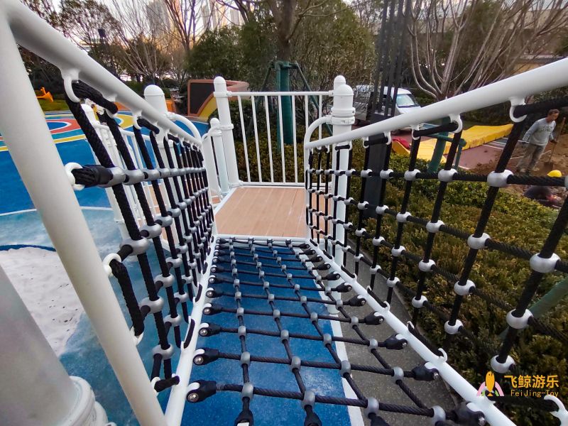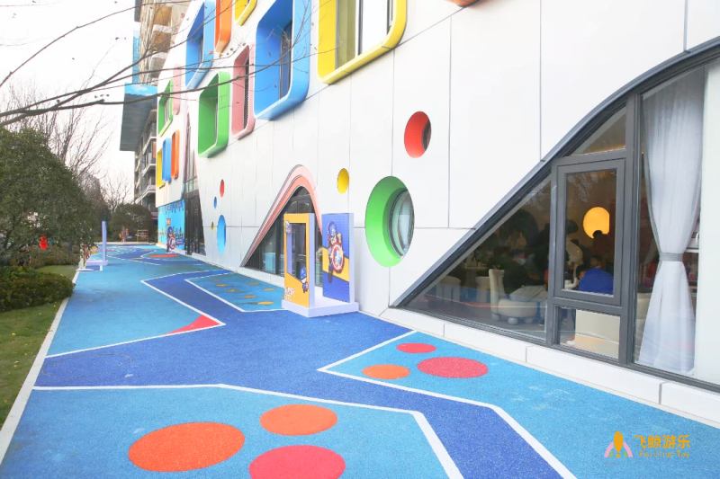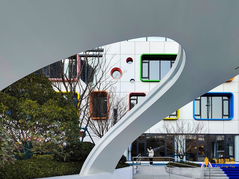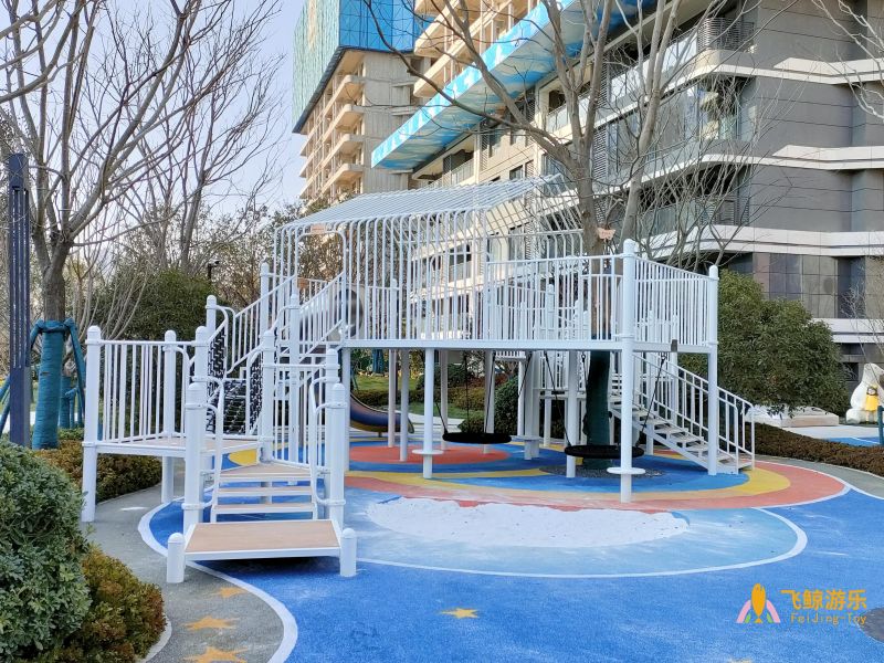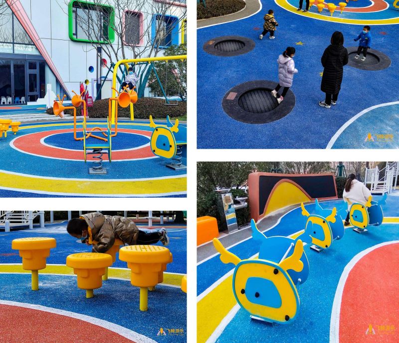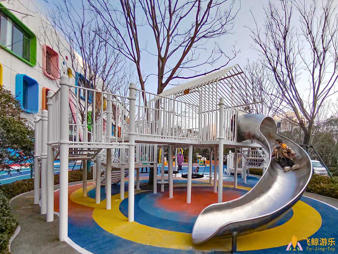 乐园设计围绕树屋展开,构筑悬置空中的小屋景观平台,平台两侧步梯、湖北爬网形成上下联通的步道,多向的空间流线增强了自由度与开放性,同时让空间更具新奇有趣的视觉感。树屋下是多种多样的游玩设备,构建出亲子互动的沉浸式体验场所。