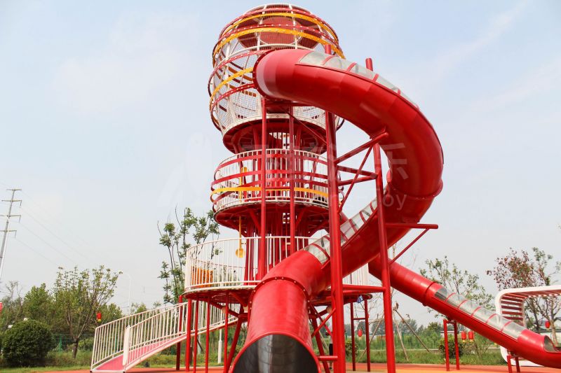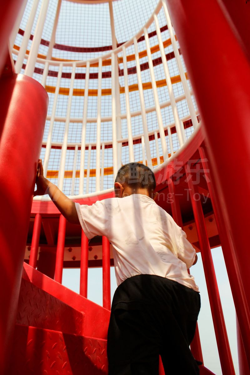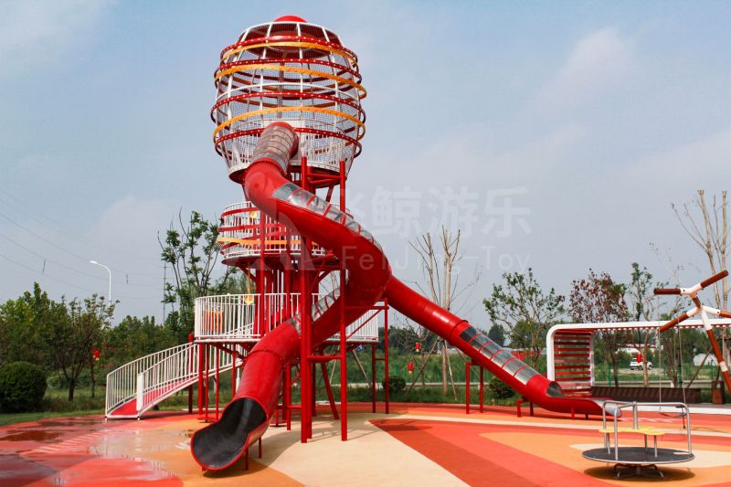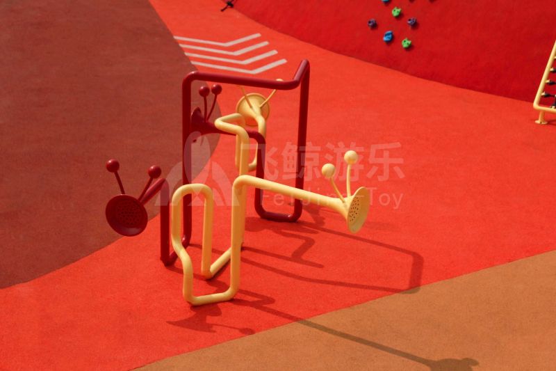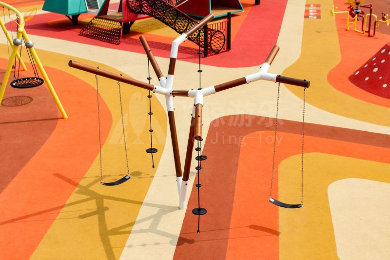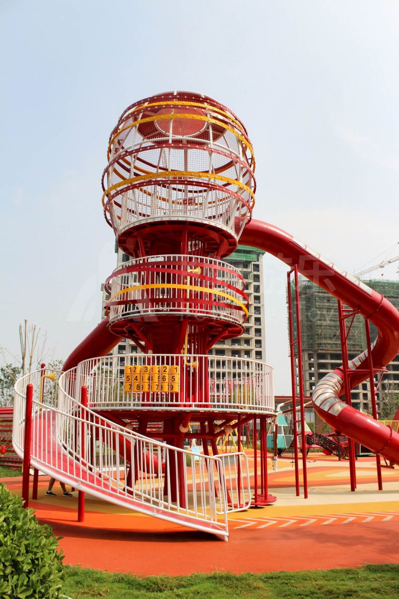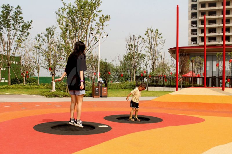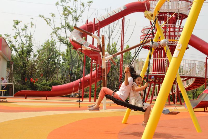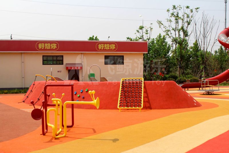 场地整体设计以集团产品“红枣”--红枣色系规划设计,彩色地绘红橙相间激发活力之情。灯塔滑梯由红枣造型设计提炼而成,白天他是火热的高塔滑梯,夜里他是闪烁美丽的灯塔。双滑梯体验不同高度滑落快乐,搭配益智小设备,湖北打击乐器、数字滚筒,玩法更多样。 勾勒地形,攀登或者滑下起伏之间多一种趣味,湖北爬网、攀登点、爬绳,总有一种让你体会到攀爬的快乐。精灵树屋乐趣多,攀爬至不同树屋,是属于自己秘密基地。驻足一番,看看风车,感受下夏天的风。绳网、木板、 多种材质攀爬和触摸,都在和自然对话。亲近自然的空间往往能够提供无形的吸引力,更多丰富的材料和空间,感知自然、与自然互动,能够让孩子们沉浸其中。 湖北秋千荡漾着,荡起内心的欢愉、安逸。大大的鸟巢秋千,可以坐着躺着,和小伙伴背靠背也是不错选择。月亮秋千给人梦幻感觉,让荡秋千多了一种梦幻感觉。骑上摇摇车,摇呀摇,摇到记忆里最快乐的时光。远处有朵散落的云,站在云朵上,蹦蹦跳跳。 飞鲸游乐本次儿童空间设计遵循趣味性的原则,曲线宽阔的奔跑环境、丰富活泼的色彩激起儿童自在玩耍。趣味设备点缀在场地各处,让儿童主动探索发现乐趣,尽情挥洒他们的天真与烂漫。