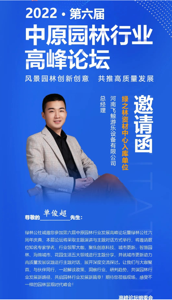 很荣幸我司作为受邀方参加第六届中原园林行业发展高峰论坛暨绿林公社六周年庆典,河南飞鲸游乐设备有限公司是一家集创新研发、规划设计、生产、销售、售后服务为一体的综合型儿童湖北无动力游乐设备供应商,生产基地位于国内最大的游乐设备基地浙江温州桥下镇,飞鲸与众多设计院、专业设计人才、创新型材料厂商携手,提供最具创意和安全的儿童活动空间以及产品整体解决方案。