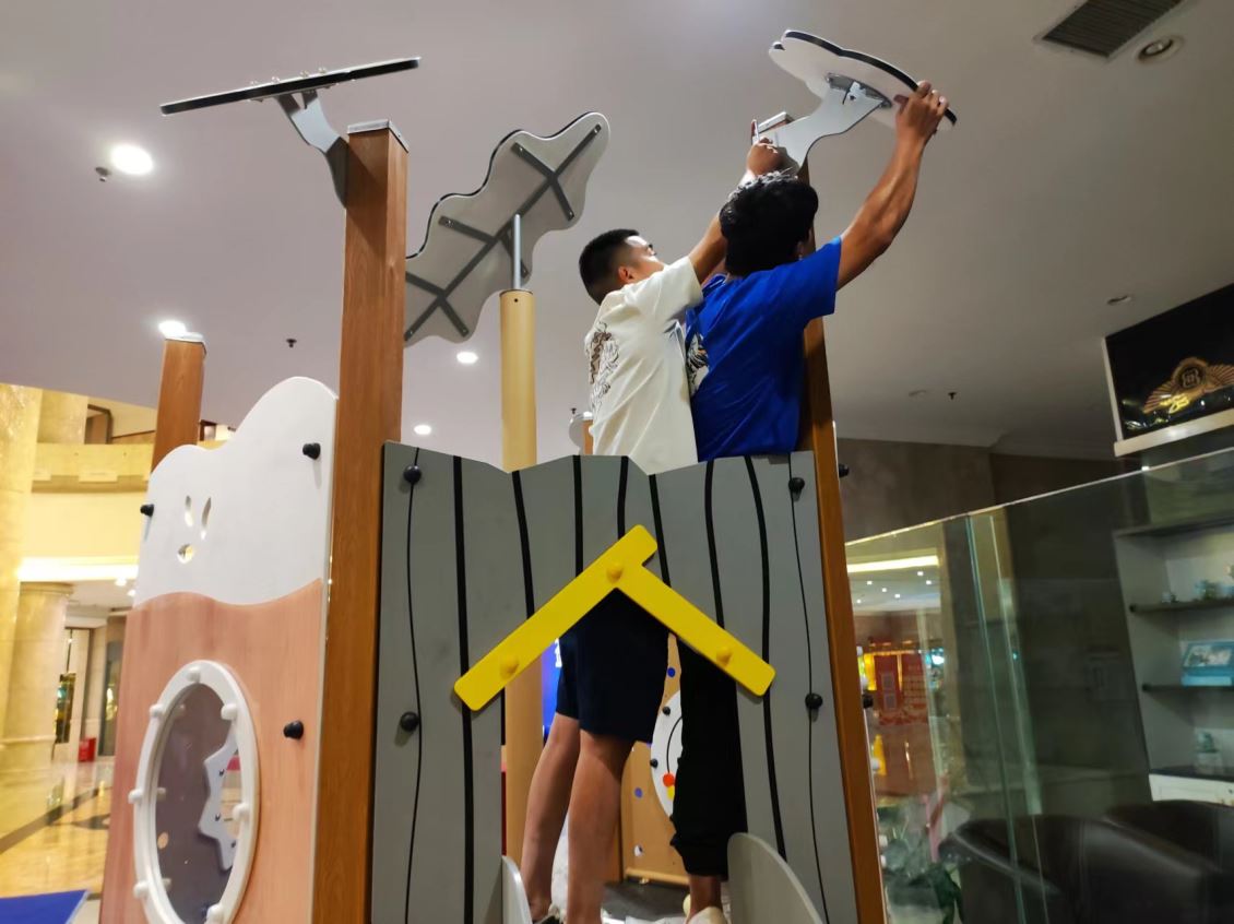 在会展布置过程中,我司搭建了滑梯展品,受到多人围观询问,运用视频媒介展示项目宣传片,引得群众驻足观赏。